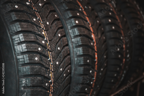New winter studded tyre with metal spikes in store, rubber auto car wheels