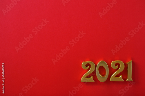 New Year 2021. The inscription of the golden numbers 2021 on red background. Festive bright photo