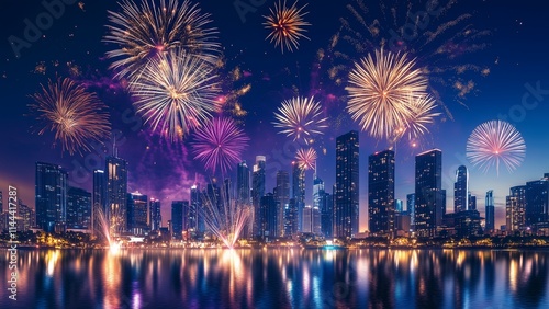 New Year 2025 success concept with colourful fireworks exploding over a modern city skyline,reflection on water emphasizing progress and growth, sleek and vibrant, high resolution, perfect lighting