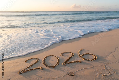 New year 2026 written on sandy beach with gentle ocean waves at sunrise, symbolizing fresh beginnings