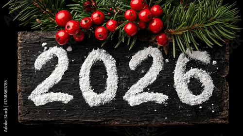 new year, 2026, celebration, holiday, decoration, winter, greenery, pine, berry, rustic, chalk, blackboard, festive, snowy, seasonal, closeup, wooden, numeric, text, vibrant, fresh, joyful, traditional, design, bright, happy, message, background, nature, detail, colours, event, concept, greeting, mood, cheer, arrangement, composition, elegance, simplicity, aesthetic, party, year
