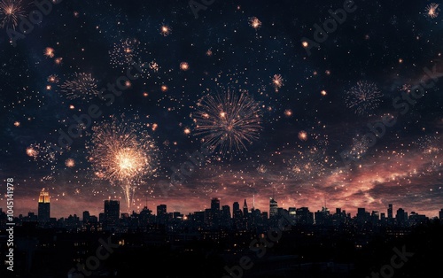 New Years Eve: Fireworks bursting in the sky above a city skyline, with a blank space in the lower half for a New Year's greeting. Professional stock photo on white background