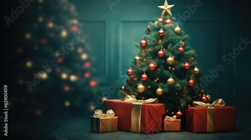 New Year's tree decorated with New Year's balls and garlands in the interiors with gifts