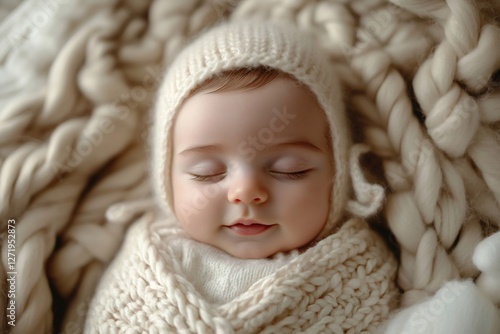 newborn, baby, sleeping, peaceful, knit up, knitted, clothes, bonnet, soft, blanket, beige, wool, chunky, merino, cosy, comfortable, serene, calm, calmness, innocence, purity, childhood, delicate, precious, love, care, tenderness, portrait, closeup, topview, photo, studio shot, indoor, daytime, natural light, high key, soft focus, copy space, horizontal, one person, infant, toddler, girl, boy