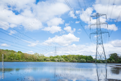 Newburn UK: 24th May 2021: Flooded farmland at Throckley Reef (Reigh) in North England. Flooded field with electricity pylons