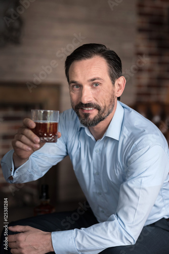 man, nice, happy, hold, hand, glasses, cheer, good-looking, delighted, cheerful, whiskey, smile, look, closeup, alcohol, indoor, contemporary, businesslike, brown, person, bourbon, manhood, alone, leather, design, interior, inside, dark, masculinity, single, affair, success, adult, beverage, business, masculine, modern, drink, brandy, bottle, daytime, study, room, businessman