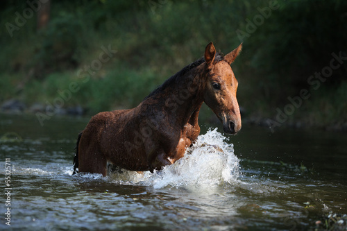 horse, animal, foal, filly, colt, warmblood, water, play, playing, kick, kicking, bathe, bathing, raking, scramble, action, move, moving, brown, fast horse, halter, mammal, 1, young, summer, colours, domestic, equestrian, equine, outside, thoroughbred