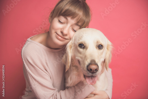 Nice teen woman and her beautiful Golden Retriever dog over pink background