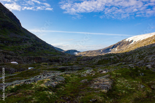 mountain, landscape, sky, mountain, nature, summer, blue, cloud, view, vale, travel, cloud, rock, green, hill, grass, park, peak, europa, high, tour tourism, beautiful, norge, background