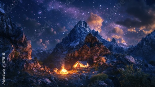 night, camping, star, sky, campfire, fire, mountain, snow, peak, rock, landscape, nature, adventure, travel, wilderness, scenic, view, majestic, serene, tranquil, dark, bright, light, shadow, cold, warm, exploration, journey, climbing, hiking, solitude, peace, beauty, power, immensity, awe, wonder, stillness, freedom, mystery, galaxy, cosmos, universe, terrain, summit