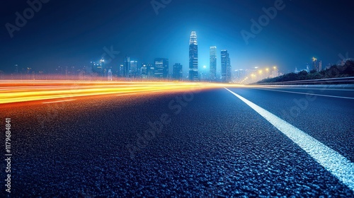 city, night, road, highway, asphalt, light, traffic, city landscape, urban, modern, building, skyscraper, speed, motion, blur, streak, transportation, travel, journey, future, technology, progress, development, dynamic, energy, vibrant, perspective, horizon, dark, blue, orange, yellow, white, lane, line, curve, background, texture, design, illustration, abstract
