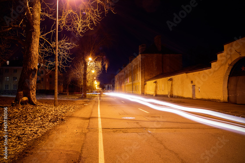 night, road, street lighting, speed, transport, car, city, city landscape, dark, dusk, empty, evening, illuminated, illumination, light, path, street, street light, street light, tour tourism, town, traffic, trail, travel, tree, twilight, urban, view, yellow