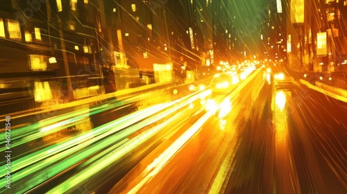 night, city, street, car, light, speed, blur, rain, wet, road, traffic, motion, urban, glow, bright, yellow, gold, orange, green, dark, vibrant, modern, fast, energy, dynamic, abstract, futuristic, transportation, travel, journey, rush, tied-up, illuminated, streak, line, perspective, driving, automobile, vehicle, city landscape, background, texture, pattern, design, art, illustration, graphic