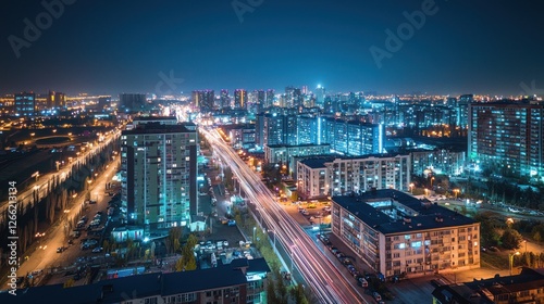 city, night, light, building, urban, skyscraper, skyline, city landscape, illuminated, metropolis, modern, architecture, street light, highway, road, traffic, vehicle, tower, highrise, structure, concrete, asphalt, nightlife, city lights, evening, darkness, illumination, glow, bright, aerial, view, perspective, panorama, long exposure, blue, teal, orange, night photography
