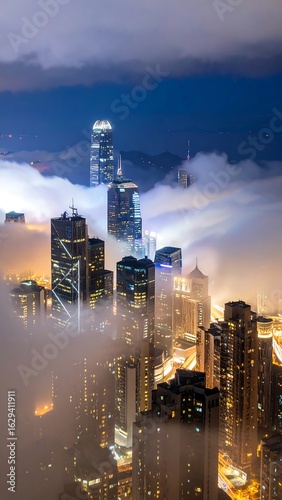 city, night, skyscraper, cloud, fog, light, urban, building, city landscape, view, high, up high, tower, modern, metropolis, asia, dense, illuminated, scene, dramatic, atmosphere, horizon