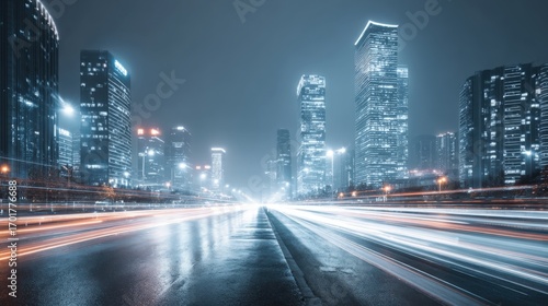 Night cityscape view with blurred light trails of vehicles in a modern urban environment