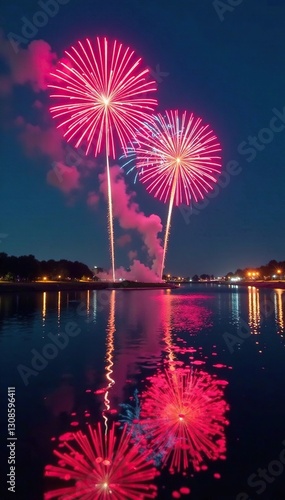 Night fireworks reflecting on water, vibrant colors, city, summer