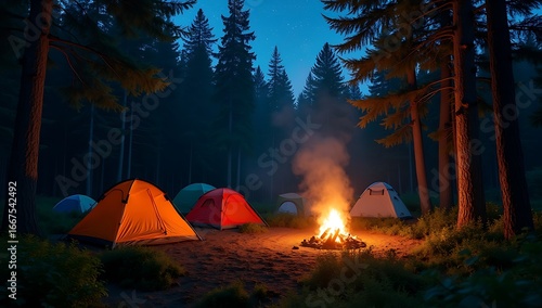 Night Forest Camping Circle with Glowing Tents and Campfire