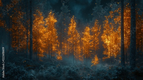 Night forest fire, burning trees, smoky, eerie, fantasy