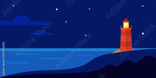Night Lighthouse Guiding Light on Coastal Seascape Illustration