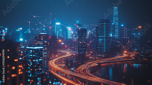 nightlight, modern, business, network, interconnected, city landscape, future, smart, wireless, connect, people, night, city, technology, light, urban, building, skyline, view, computer, design, skyscraper, architecture, street, bangkok, energy, pattern, light, dark, traffic, digital, aerial, downtown, motion, datum, transportation, application, software, cyberspace, solution, skyscraper, tech