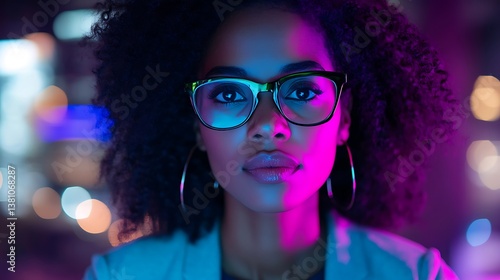 woman, portrait, night, city, light, goggles, confident, style, fashion, beauty, hair, afro, urban, modern, cool, pose, expression, serious, elegant, stylish, attractive, dark, purple, blue, neon, glow, lighting, sharpened, closeup, model, girl, female, person, face, eye, look, earring, jacket, bokeh, vibrant