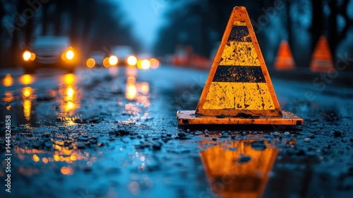 road, warning, signs, wet, night, traffic, caution, triangle, safety, hazard, light, car, puddle, dark, orange, yellow, black, mud, street, urban, driving, travel, journey, transportation, evening, asphalt, water, surface, texture, blur, background, sharpened, depth, detail, low, illumination, photo, image, night time