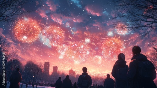 new year, people, watch, vibrant, fireworks, explode, city, skyline, celebration, night, event, show, spectacular, display, colourful, festival, light, sky, bright, festive, urban, view, crowd, audience, cheering, enjoy, entertainment, holiday, excited, joy, happiness, joyful, group, outdoors, summer, evening, sparkle, beautiful, awe, illuminated, city landscape, building, architecture, famous, landmark, travel, destination, holiday maker, bursting