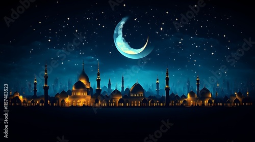 mosque, crescent, moon, night, sky, star, city, city landscape, building, architecture, islamic, religion, faith, islam, spirituality, dome, minaret, tower, light, illuminated, gold, glow, dark, blue, black, background, scene, illustration, design, artwork, graphic, image, picture, digital, art, beautiful, peaceful, serene, majestic, holy, ramadan, eid, celebration