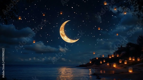 night, moon, sky, star, sea, beach, lantern, beautiful, peaceful, night time, cloud, landscape, nature, romantic, ocean, calm, light, gold, twilight, illuminated, glowing