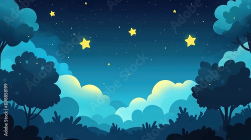 night sky, star, tree, cloud, landscape, nature, night, blue, illustration, dreamy, peaceful, calm, serene, artwork, art, digital artwork, fantasy, magical, whimsical, twilight, evening, celestial, cosmos, space, sky, background, wallpaper, pattern, texture, design, graphic, vibrant, colourful, bright, dark, silhouette, foliage, branch, leaf, forest, wood, plant, shrubbery, bush, meadow, field, hill, mountain