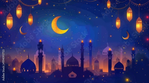 night, sky, crescent, moon, star, mosque, silhouette, city, landscape, illustration, blue, dark, gold, light, orange, glow, beautiful, gold, shining, sparkling, fantasy, art, digital, graphic, design, arabic, islamic, religion, culture, tradition, spirituality, faith, holy, celebration, festival