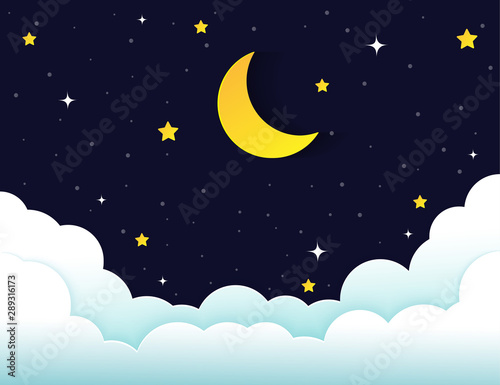 night sky with stars and moon. paper art style.Vector of a crescent moon with stars on a cloudy night sky. Moon and stars background.Vector EPS 10.