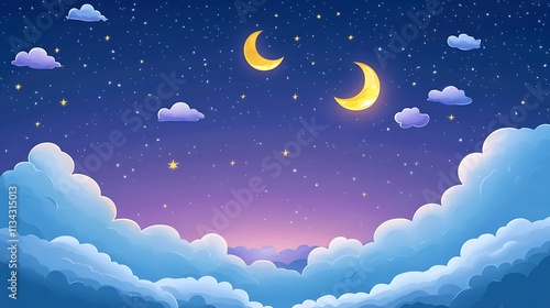 night, sky, moon, star, cloud, crescent, fluffy, dreamy, night time, scene, glowing, scattering, blue, purple, yellow, white, dark, bright, background, illustration, cartoon, art, digital, nature, space, astronomy, cosmic, celestial, fantasy, magical, whimsical, peaceful, serene, romantic, dreamlike, beautiful, abstract, pattern, texture, soft, smooth, airy, light