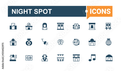 Night Spot icon collection. Contain linear symbols disco, party, bar, night, alcohol, drink, entertainment and more. Nightclub icon set. Minimal icons collection. Pixel perfect. Editable vector.