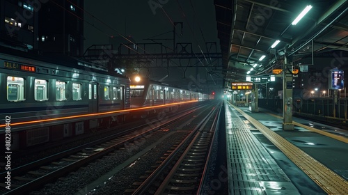 train, station, night, city, light, platform, track, railway, transportation, urban, travel, japan, public, dark, commute, passenger, building, city landscape, evening, city life, night time, dark blue, red light, wet, concrete, steel, infrastructure, futuristic, modern, abstract