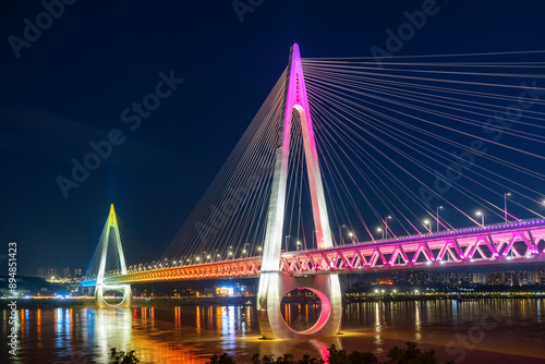 Night view of Baiju Temple Yangtze River Bridge, Chongqing, China.Chinese translation: Baiju Temple Yangtze River Bridge