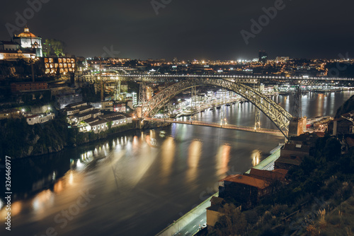 Night View of Luis I Bridge Crossing Douro River in Porto, Portugal