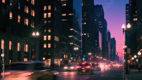Night view of the city street, with tall buildings, interwoven street lamps and car lights, and a pink - purple sunset glow in the sky, showing the prosperity and romance of the city.