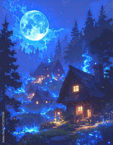 night, village, moon, forest, blue, mystical, glowing, house, cosy, magical, fantasy, wooden, rustic, illuminated, light, calm, peaceful, nature, mountain, star, sky, tree, pine, hill, path, cabin, charming, dreamlike, bungalow, landscape, quiet, adventure, illumination, whimsical, enchanted, serene, fairy, wonderland, imagination