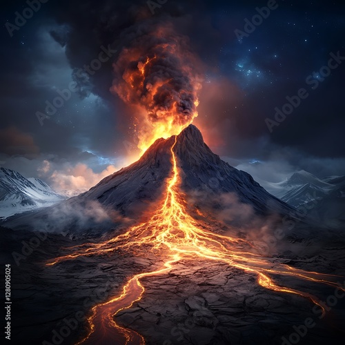volcano, eruption, lava, fire, night, mountain, sky, star, cloud, dramatic, intense, fiery, landscape, nature, geology, volcanic, magma, heat, power, energy, explosion, danger, hazard, disaster, destruction, apocalypse, dark, light, contrast, texture, rock, stone, earth, ground, glow, orange, red, black, grey, night sky, astronomy, cosmic, universe, powerful, force, natural, phenomena, spectacular, awesome