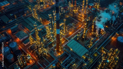 Nighttime aerial view of illuminated oil refineries and chemical plants in an industrial zone, showcasing the vibrant activity with this inviting photo. a