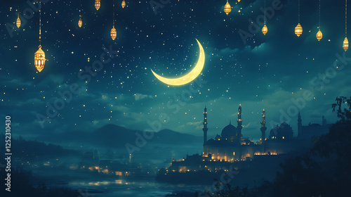 night, city landscape, mosque, crescent, moon, star, lantern, light, city, building, architecture, islamic, religion, faith, spirituality, peace, serenity, calm, tranquil, dark, blue, teal, water, river, sky, cloud, gold, illumination, glow, mystical, magical, dreamlike, fantasy, ambience, atmosphere, beauty, picturesque, scene, view, horizon, silhouette, tower, minaret, dome