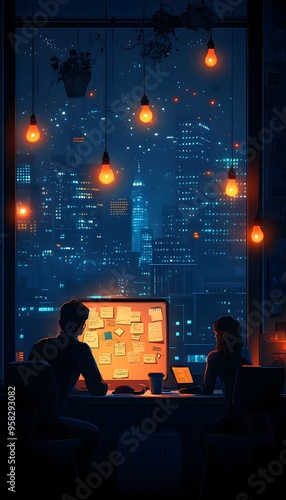 Nighttime Cityscape View From Window with Two People Working at a Desk - Illustration