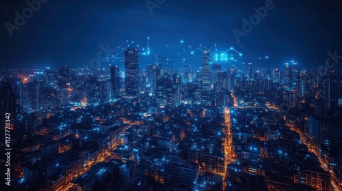 city landscape, night, urban, city, skyscraper, building, light, network, connection, technology, digital, futuristic, modern, architecture, urbanisation, skyline, illuminated, glow, blue, dark, nightlife, metropolis, street light, street, downtown, aerial, view, overhead, perspective, sprawl, smart, datum, connectivity, wireless, communication, cyberspace, infrastructure, electronic