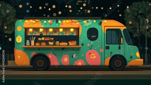 night scene, illuminated, vibrant, whimsical, catering, take-away, evening, darkness, light, bokeh, urban, contemporary, design element, teal, orange, delicious, tasty, hunger, appetence, snack, meal