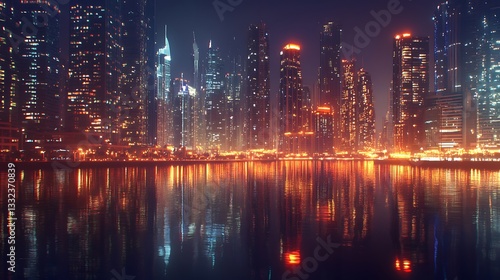 Nighttime skyline view of vibrant cityscape with reflections high resolution picture