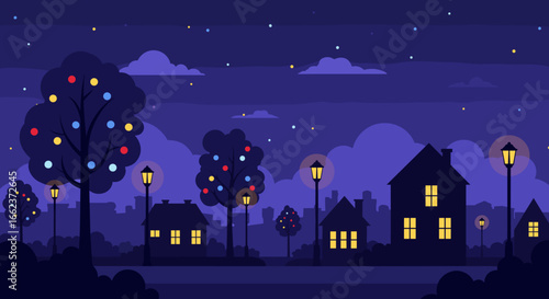 Nighttime street scene with colorful lights residential area digital art urban environment wide view cozy atmosphere. Vector illustration