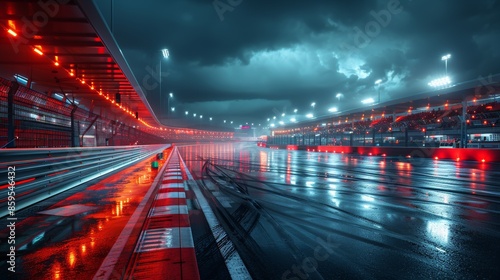 Nighttime View of Wet Race Track With Illuminated Stands and Red Lights