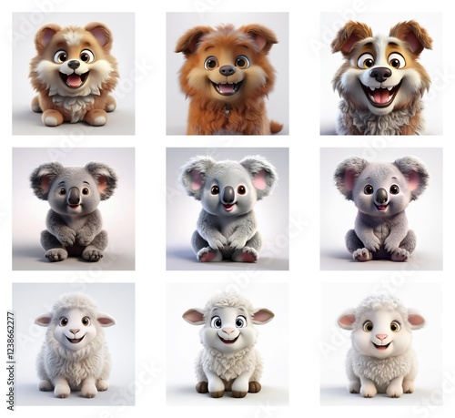 three-dimensional, adorable, animal, animal, art, artwork, baby, brown, cartoon, character, charming, closeup, collage, collection, cuddly, cute, design, digital artwork, dog, endearing, expression, eye, face, fauna, fluffy, friendly, furry, graphic, grey, grid, happy, illustration, image, innocent, joyful, koala, lamb, mammal, mouth, nose, paw, playful, portrait, puppy, realistic